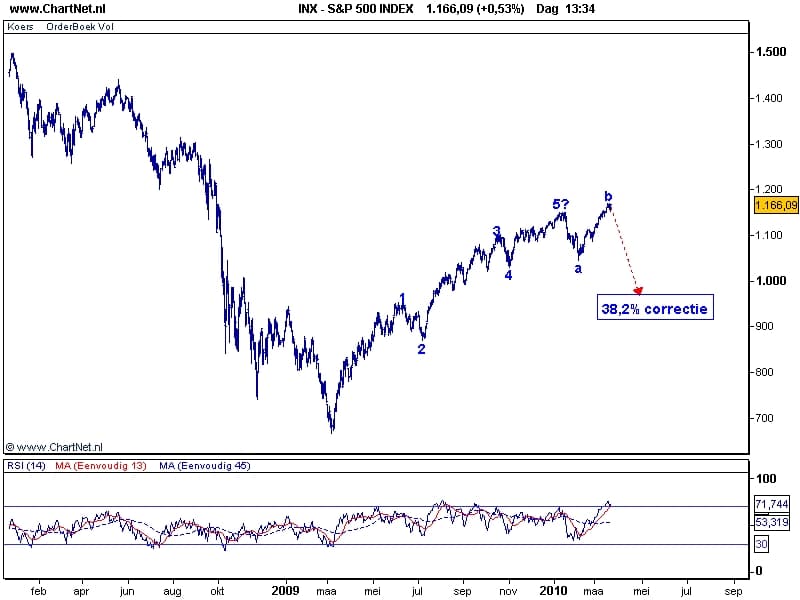 Dergelijke verhoudingen kunnen mogelijk wijzen op een belangrijke top. Tevens is er sinds de bodem van maart vorig jaar een vijf structuur waarneembaar. Indien we met een top te maken hebben dan is een correctie over deze beweging met 38% tot 61% mogelijk.