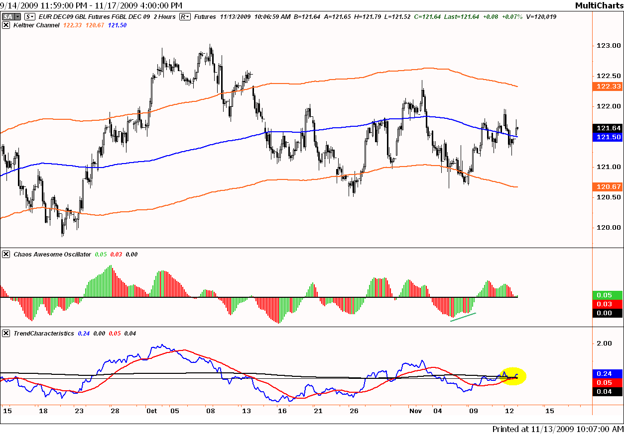 De rente wil weer dalen ofwel, beleggers lijken aandelen weer om te ruilen voor obligaties. Dat is niet positief voor de aandelenmarkten. U ziet in de grafiek dat na een consolidatie van de rente (bundfuture 10 jaar) het 200 VG (2-uursgrafiek) opwaarts wordt uitgenomen, waarbij de indicator alle cycli centraal stelt. Dat geeft aan dat dit waarschijnlijk de start van een nieuwe beweging is, ofwel de rentedaling is reeds gestart.