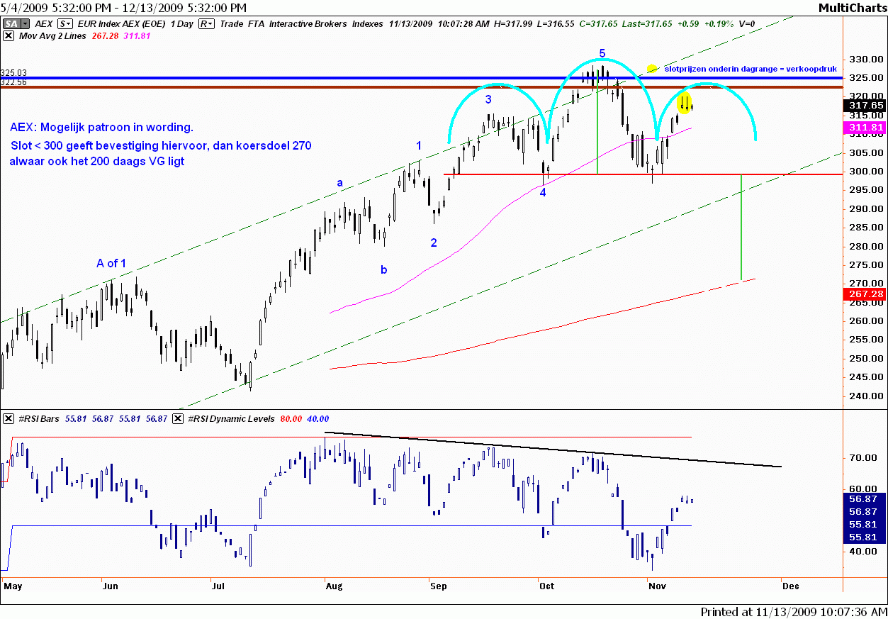 AEX-Short, entry 322, stoploss 330 op slotbasis, koersdoel 290 resp. 270.