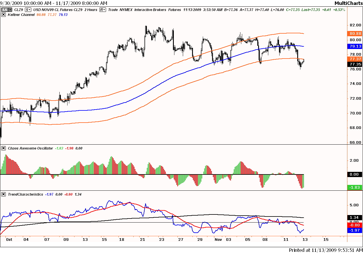 Olie wordt ook in dollars verhandeld en ook daar zien we koersdruk ontstaan. Na een lange zijwaartse periode valt Olie nu uit de Keltnerband (2-uursgrafiek) wat wil zeggen, dat de bulls een gevoelige tik hebben gekregen. Gelet op de correlatie tussen dollar en commodities zal een stijgende dollar druk op de olieprijs uitoefenen. Daarbij is het wel van belang rekening te houden met de idee of de vraag- en/of aanbod zijde van olie in het geding is. Vanuit puur economisch opzicht is een dalende olieprijs niet positief, want er is minder vraag.