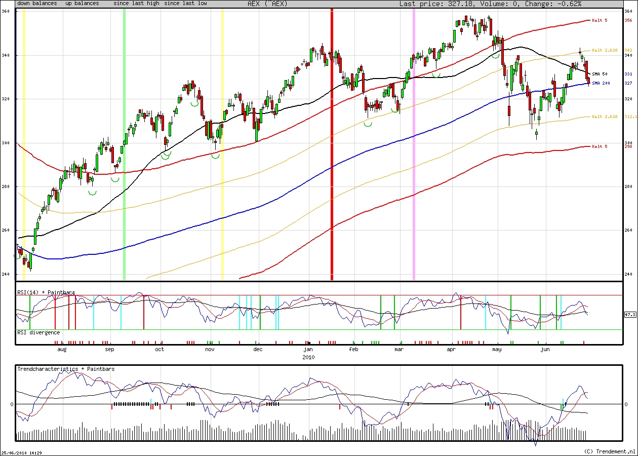 Vorige week gaf ik aan dat de AEX kleur moest gaan bekennen. Dat is nog niet gebeurd. Tussen globaal 320 en 340, waar veel belangrijke voortschrijdende gemiddeldes bewegen, geeft de AEX aan nog niet te weten wat te doen. Ik verwacht vandaag of maandag een ‘low’, die de start van een opwaartse beweging moet inleiden. De eerlijkheid gebiedt te zeggen dat er relatief weinig houvast is voor deze stelling, dus neem ik geen posities in nu.
