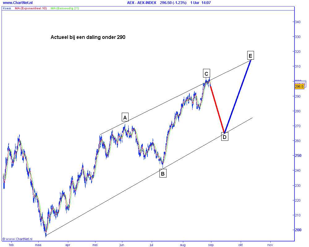 Indien de AEX onder 290 zakt dienen we rekening te houden met een daling tot ongeveer 260. (zie onderstaande grafiek)