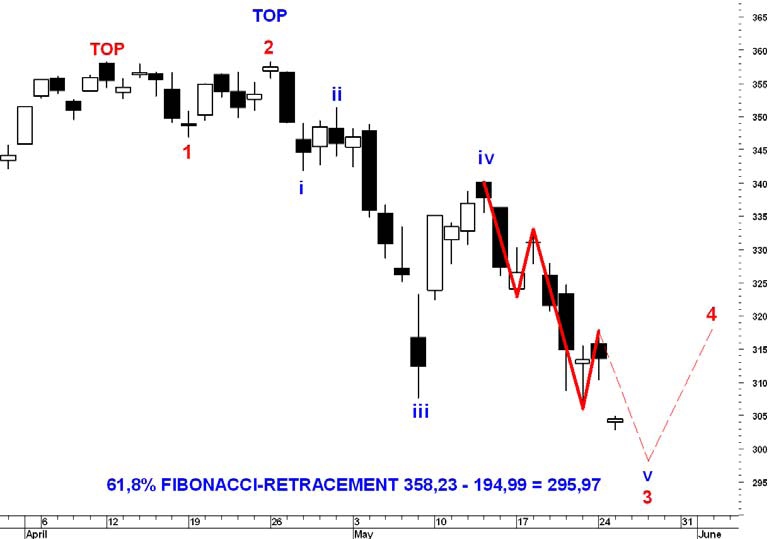Momenteel zijn we volgens hem hard op weg om het koersdoel rond 296 op te zoeken. De geactualiseerde Elliott Wave golvenstructuur wijst op dit moment op een vijfde golf gerekend vanaf de top (=358,23) op 26 februari jl. Dat betekent dat een complete dalende golf eerdaags wordt afgerond, waarna er weer opwaartse kansen ontstaan richting 320.