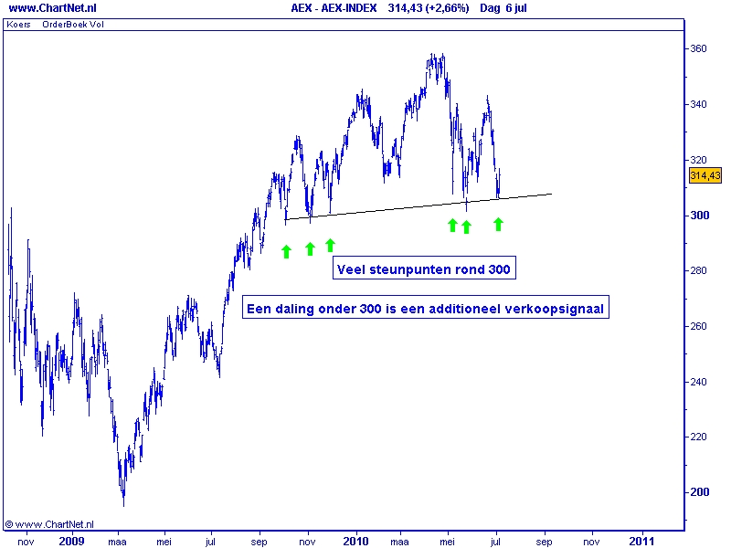 Een kop schouderformatie, met een doel van 240, een normale 50% correctie over de stijging op 276 of een diepere variant, een 61,8% correctie op 257. Er zijn nogal wat mogelijkheden. Ik ga me niet mengen in een discussie of er nu wel of geen sprake kan zijn van een kop schouderformatie. Feit is dat er op weekbasis wel wordt voldaan aan de voorwaarden van een kop schouderformatie maar dit is slechts voor de AEX van toepassing. Een ander feit is dat de koersen onder 300 punten voor de AEX een versnelling van de daling op kunnen leveren, omdat de AEX op dit punt vijf keer steun heeft gevonden, dus een daling onder 300 punten levert een additioneel verkoopsignaal op.