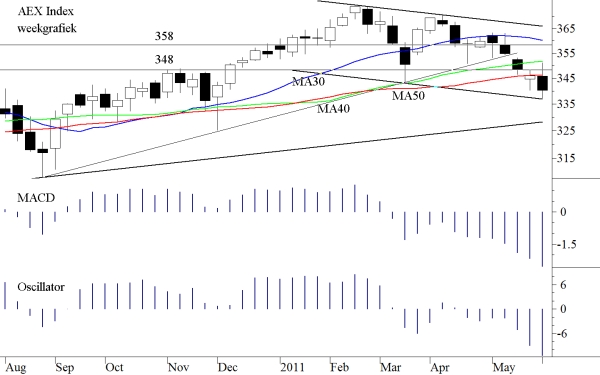 Hierboven ziet u de grafiek van de AEX Index op weekbasis. De onderzijde van het dalende kanaal werd bereikt. Drie lange termijn gemiddeldes werden doorschreden. Er is sprake van dalende toppen en dalende bodems. Alleen de lange termijn oplopende trendlijn is nog intact.
