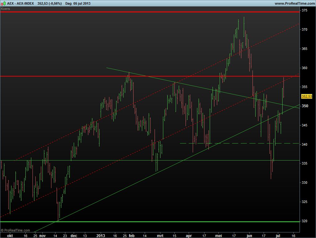 Vorige week schreef ik: “We zien in de grafiek een driehoek waarbinnen de AEX gevangen zit. De onderkant is 333 en de bovenkant is 347 punten. Merk op dat de stijging van de afgelopen week met een relatief laag volume gepaard is gegaan, dat is geen sterk signaal dat de correctie voorbij is. Een uitbraak boven de 347 punten zou de beurs richting de 350 punten brengen. Gegeven de korte termijn bodem verwacht ik nog een herstel maar de potentie hiervan is zwak. Op middellange termijn staan de signalen op rood.”