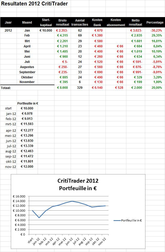 1. U kunt de gedetailleerde resultaten van de gesloten posities hier bekijken: http://www.dekritischebelegger.nl/wp-content/uploads/2012/03/CT-trades-2012-tot-en-met-13-november-20121.jpg