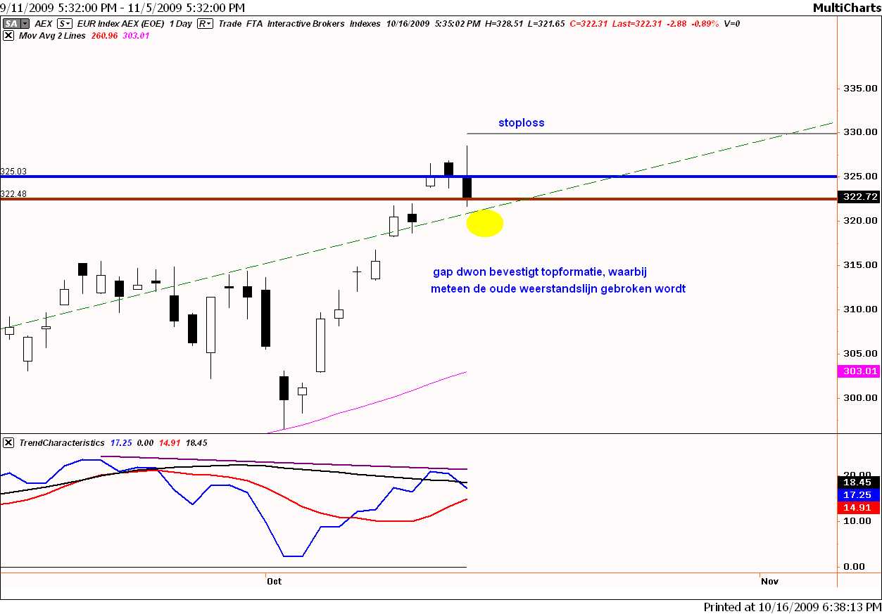 Op dinsdag heb ik op het forum aangegeven, waar ook column van gemaakt is (Wat gaat de AEX doen?) toch short te zijn gegaan op 322 met een stoploss van 330. Dit, omdat daags erna wel aan de minimale prijsvoorwaarden van topvorming was voldaan en er een dreigend patroon leek te ontstaan. Daags erna toch weer hoger, waarna ook de uiterste doelen behaald zijn. De AEX behaalde namelijk 325 en de Estoxx 50 haalde 2.945.