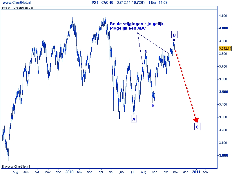 Het beeld van de AEX en de Franse CAC 40 hebben een aantal overeenkomsten, de stijging in oktober is in beide markten niet overtuigend, daarnaast zijn de twee stijgingen sinds juli dit jaar gelijk. Â Indien er sprake zou zijn van een golf 3 had je wat meer spektakel mogen verwachten. Een golf 3 gaat meestal gepaard met een uitbraak onder een forse toename van het volume. Daarvan is op dit moment geen sprake. Indien deze situatie niet snel veranderd dan kan dit marktgedrag een teken zijn van zwakte waarbij een negatief scenario nog mogelijk is. Voor de AEX is een daling onder 335 een eerste signaal in die richting. Dus zolang de AEX boven 335 noteert, dienen we uit te gaan van verdere stijgingen. Een daling onder 335 beoordeel ik als negatief waarbij mogelijk het oude scenario weer uit de kast gehaald moet worden.