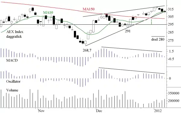 Intussen kan er nog van alles gebeuren dus reken u (nog) niet rijk. De onderzijde zal ergens rond 280 liggen als de koers daar al komt (zie ook hierboven), maar er zijn reeds vier aanraakpunten geweest en derhalve hoeft dit niveau niet meer gehaald te worden. Men kan veronderstellen dat de draai eerder wordt gemaakt en hiermede wordt het gestelde onder de korte termijn bevestigd. De indicatoren divergeren negatief maar zij zijn nog stijgende. Het (negatieve) koersgedrag van de komende week moet dus nog als bevestiging komen.