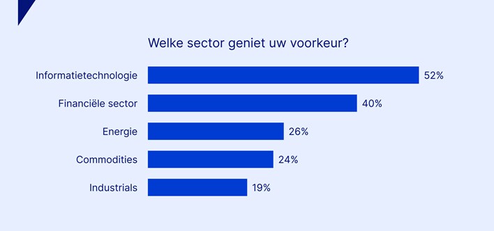 Beleggers hebben nog steeds een duidelijke voorkeur voor Informatietechnologie (52,2%), gevolgd door de financiële sector (40,0%). Daarna volgt de energiesector (26,1%), de grondstoffensector (24,3%) en de sector industrie (19,1%).