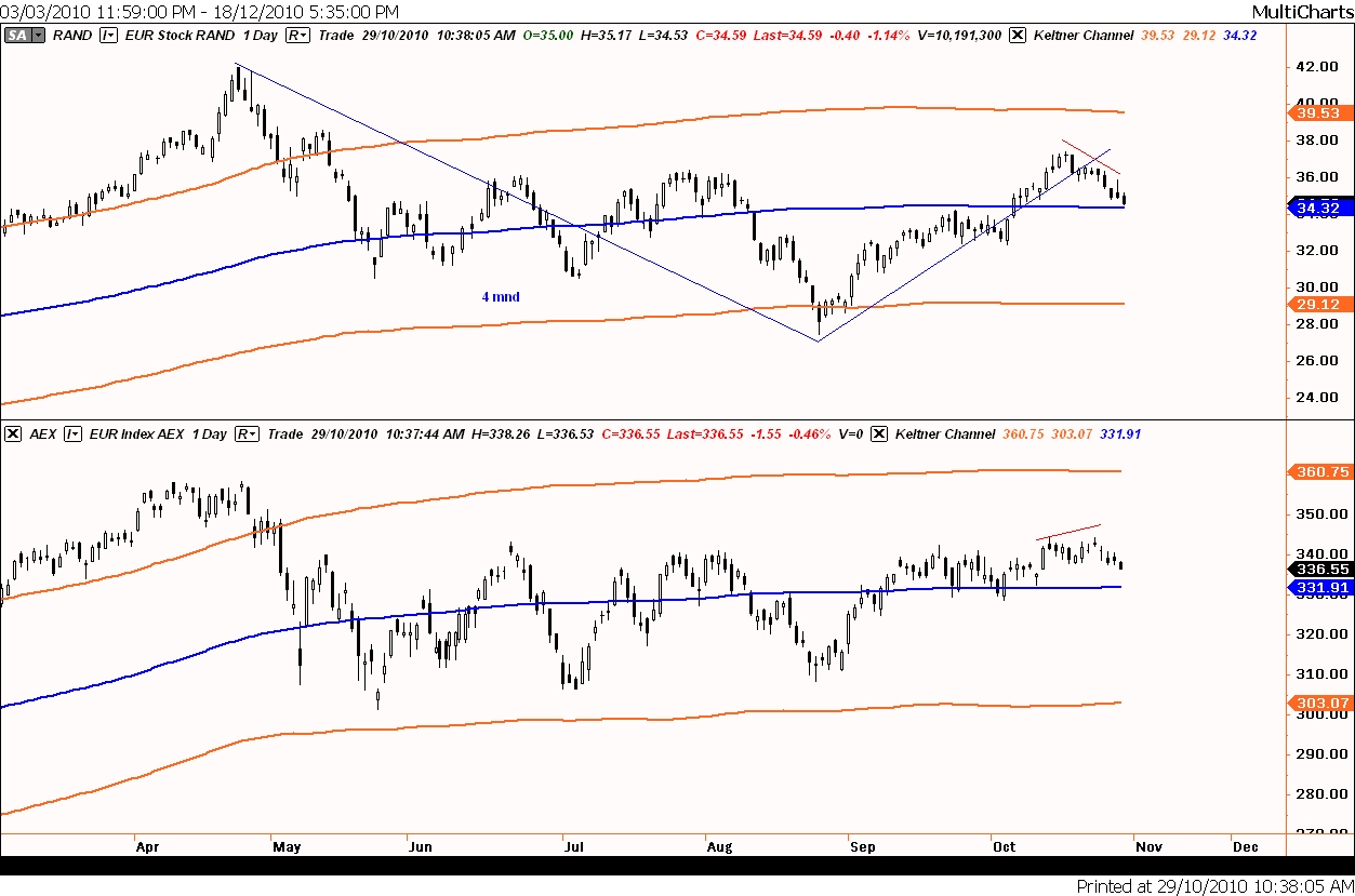 Mijn advies is dan ook erg voorzichtig te zijn, want zoals ik het nu kan overzien lijkt de tweede helft van december een belangrijke LOW te kunnen worden tenzij we op korte termijn over 345 heen springen. Welk koersdoel daar bij hoort is nog niet te zeggen. Ik houd als mogelijkheid 304, 280, 250 en mogelijk lager aan. Het voortschrijdende inzicht is nodig zekerder te worden hierover. En daarvoor moet toch echt de 330 –steun gebroken worden.