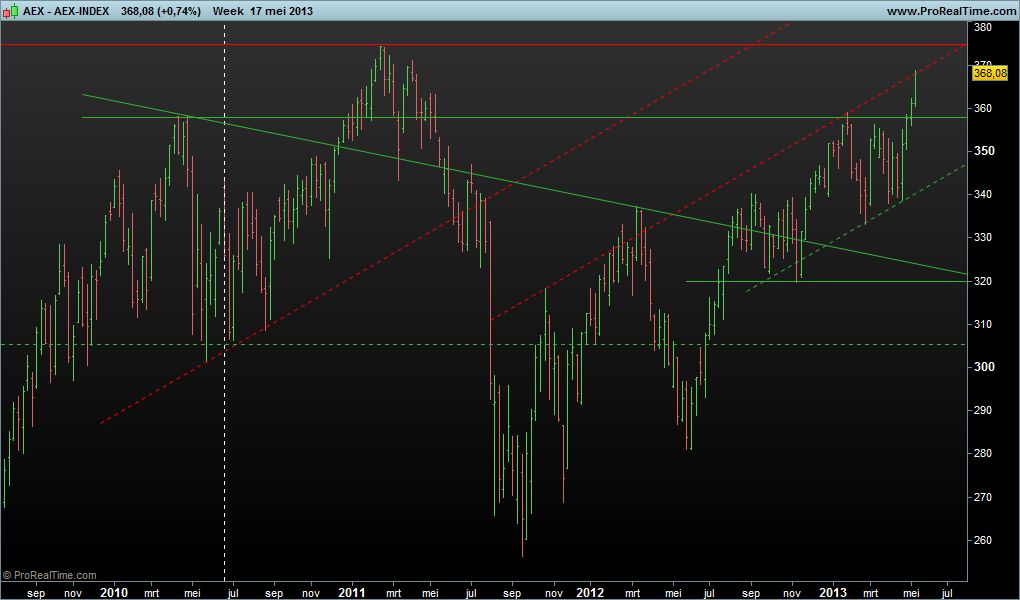 De AEX heeft ook in week 20 de opmars voortgezet. De Amsterdamse beursgraadmeter eindigde 1,9% hoger op 368,08 punten. Mijn verwachtte correctie bleef beperkt tot slechts een paar punten. Ik handhaaf mijn mening dat we  spoedig een flinke correctie gaan krijgen. In een golf 5 beweging blijven kopers kopen daar waar geen verkopers meer zijn. Als iedereen in aandelen zit en er komt een bericht dat hen angstig maakt, dan zal de kudde rechtsomkeert maken. Dit gegeven heeft Martin Amstrong duidelijk uitgelegd. Volgens hem wordt een daling niet veroorzaakt door beleggers die short gaan maar doordat iedereen zijn aandelen begint te dumpen.