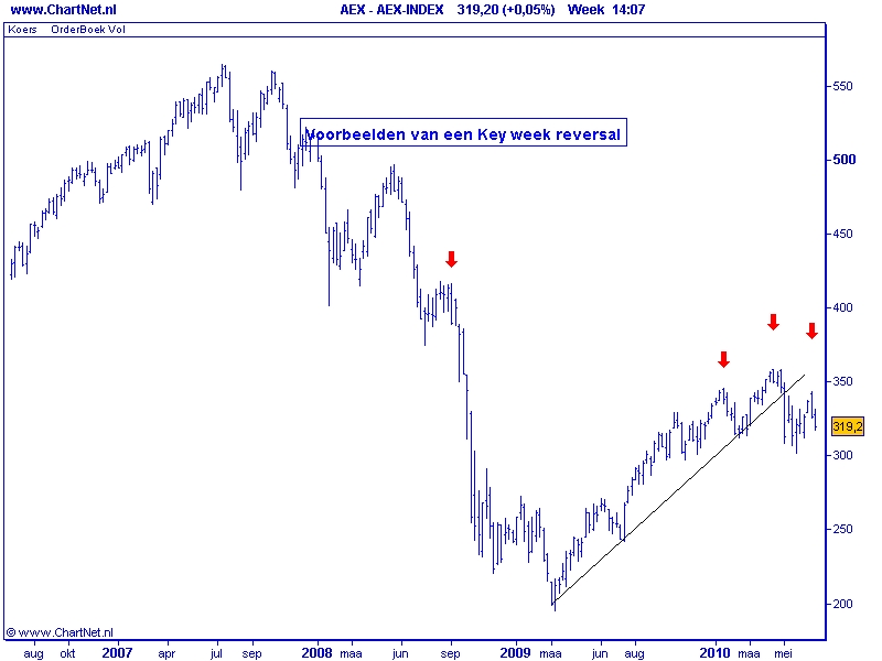 Een key week reversal is een omkeer patroon op weekbasis waarbij de koersen gedurende een week stijgen boven de toppen van de voorgaande week en sluiten onder de laagste koers van de voorgaande week. Over het algemeen zijn dit betrouwbare signalen, die duiden op een wijziging van de trend. Vorige week hebben we een dergelijk fenomeen kunnen waarnemen in de AEX, Dow Jones, S&P 500 en de Dax. Een aardig detail voor degene die van mening is dat een dergelijk omkeerpatroon meestal aan het einde van een trend voorkomt, een aantal voorbeelden in de AEX.