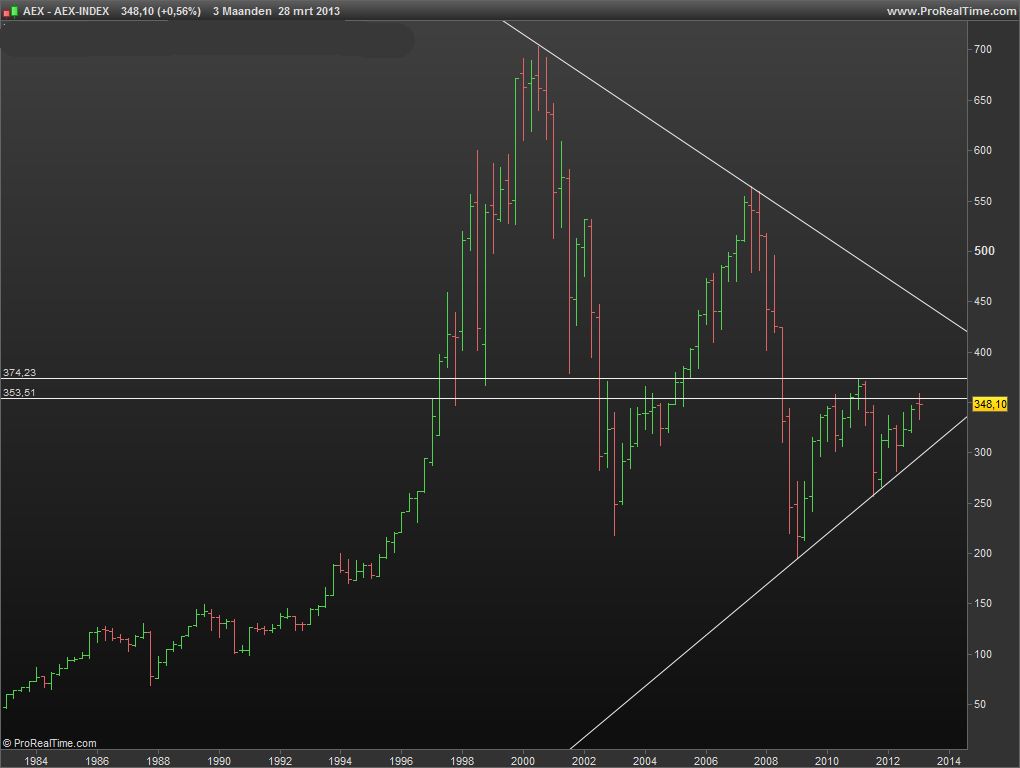 De AEX-index is dit kwartaal weinig opgeschoten. De Amsterdamse beursgraadmeter begon het jaar voortvarend. Drie maanden later staat de beurs op ongeveer dezelfde stand.  Dit is in schril contrast met de overige beurzen. De Duitse DAX-index en de Amerikaanse beurzen staan op recordniveaus. Als we onder de motorkap kijken zien we dat de AEX wel een hogere top en een hogere bodem gevormd heeft. Dit kan wijzen op hogere koersen in de komende maanden. Zie hiervoor de onderstaande driemaandsgrafiek.