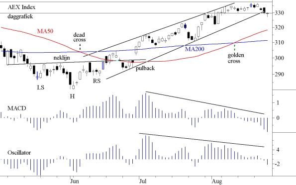 De eerste zwarte week candle (na 8 consecutieve witte) is een feit. Het ziet er naar uit dat het niet de laatste is, want de daling van de afgelopen week zorgde ervoor dat de weekgrafieken overal daalden. Het gaat dus iets langer duren met de correctie. In Nederland bleef de CPR positief en het volume bleef laag. In New York daalden de New Highs sterk maar de New Lows stegen niet en dat lijkt positief. Er was daar wel sprake van een Bearish Engulfing. In New York werd de week overigens afgesloten met een sterke dag. Het is mogelijk dat we dat gaan voelen in Amsterdam aanstaande maandag, maar dat zet de negatieve krachten hoogstwaarschijnlijk niet buiten de deur. Wij laten u hieronder de daggrafiek van de AEX Index zien om een en ander in een iets breder perspectief te zetten.
