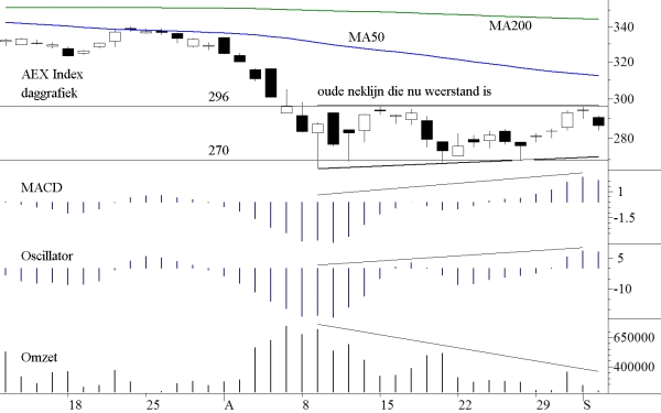 De markt in Amsterdam consolideert zoals men in figuur 1 kan zien. Tweemaal werd het niveau van 296 geraakt, De laagste koers aan de onderkant bereikte 265. Het is moeilijk om te zeggen welke patroon zich ontvouwt. In de afgelopen weken hebben wij het gehad over een dubbele Bodem, maar sindsdien is de onderkant opnieuw opgezocht. De bodems liggen in een licht stijgende lijn. Aan de bovenkant is sprake van een horizontale lijn. Deze valt samen met een zeer oude steunlijn die nu weerstand biedt. Men zou nu kunnen denken aan een driedubbele Bodempatroon.