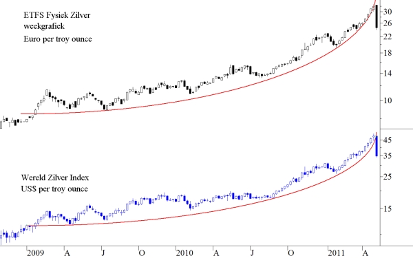 Zodra Blow-offs geconstateerd worden is het dus zaak om bijzonder voorzichtig te gaan worden. En wij vermoeden dat er in de afgelopen dagen een belangrijke Blow-off heeft plaatsgevonden in Zilver. In figuur 2 hebben wij de koersen van een Tracker opgenomen genoteerd in € en de koers van Zilver genoteerd in US$ per troy ounce. Het betreft hier een weekgrafiek, maar wel een weekgrafiek die een klein deel van figuur 1 beslaat, want ook in figuur 1 ziet u de koersontwikkeling van het Zilver, maar dan over een veel langere periode.