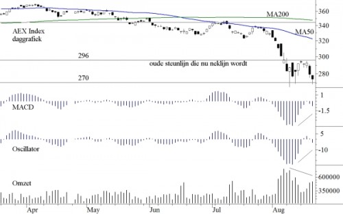 Ook een lagere tweede bodem (dus een koers een dezer dagen beneden 265) zou in principe hetzelfde plaatje ten gevolge kunnen hebben met dien verstande dat de kansen dan groter worden dat de weerstand op 296 nog een keertje roet in het eten gaat gooien en een derde bodem gaat veroorzaken, hetgeen dan zou eindigen in een Kop en Schouderpatroon, met dezelfde implicaties van stijging en van doel ten gevolge. Maar wij geloven daar niet erg in. Wij zien deze tweede bodem zich vandaag of morgen bevestigen waarna de bearmarktrally een aanvang kan nemen. Uiteraard blijft de mogelijkheid open dat de markt het voor gezien houdt en de daling voortzet zonder verdere bearmarktrally. Wij geloven daar niet in. Er is niets in de grafieken te vinden dat daarop wijst. Zoals wij vorige week schreven komt de AEX op weg naar boven achtereenvolgens (als hij zover komt) weerstandniveaus tegen op 306, 325 en 336. Dit zijn de niveaus (of liever iets daaronder) om beschermingsmaatregelen te nemen en uw portefeuille af te dekken.