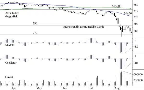 Maar laat u niet in slaap wiegen. Reeds eerder hebben wij erop gewezen dat de markten in een baisse zijn gekomen. Het Dead Cross dat wij in Amsterdam al op 15 juni zagen opduiken ziet men nu in meer en meer markten verschijnen. De S&P500 liet het op 8 augustus zien en de DAX volgde op 10 augustus. Voorlopig is er maar één conclusie mogelijk en dat is dat de markten op weg zijn naar hun dieptepunten van maart 2009. De AEX zette toen een bodem op 194.