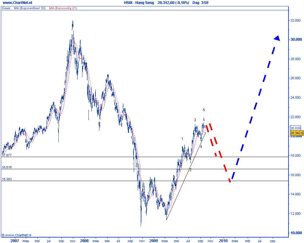 Technische analyse van de Chinese Hang Seng op 6 oktober 2009 (op basis van Elliot Wave) correctiescenario