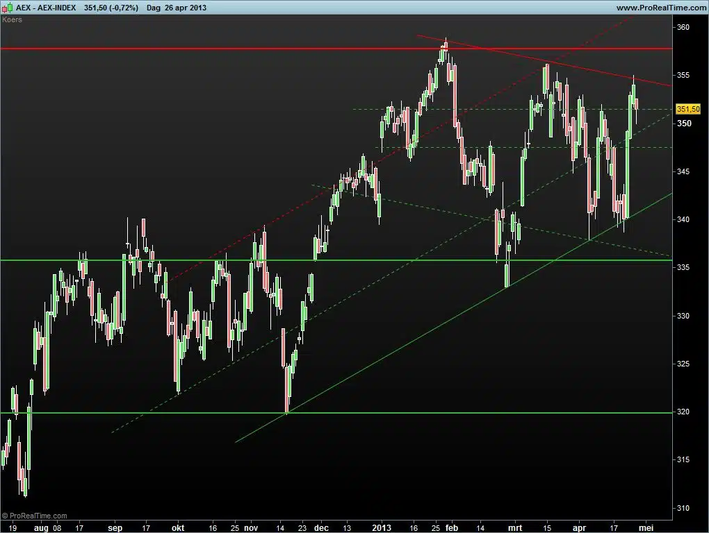 In de onderstaande grafiek kunnen we een W-patroon zien. Na een daling begin februari trad een herstel op en werd een deel van de zwakte goedgemaakt tot 356 punten. Vervolgens trad er weer een correctie op waarna de koersen wederom herstelden. De beurs maakt steeds hogere bodems maar zolang de weerstand op 356 punten en vervolgens 359 punten niet gebroken wordt, is er nog steeds kans op een daling.