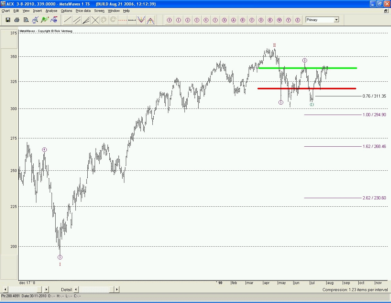 Ook de afgelopen week is weer bijzonder beweeglijk geweest. Een felle daling naar de 327 zone voor de AEX gevolgd door een even zo snel herstel. Dit geeft ons belangrijke info voor het verdere vervolg op korte termijn. Alle ogen zijn gericht op de toppen van de afgelopen week.