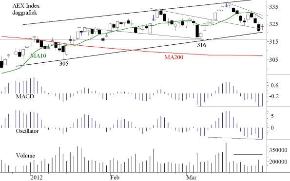 De belegger bleef dus wijselijk thuis. Hij deed niet mee aan de daling. Een koers beneden 321 is zeer vervelend. Een koers beneden 316 zet de boel op scherp.