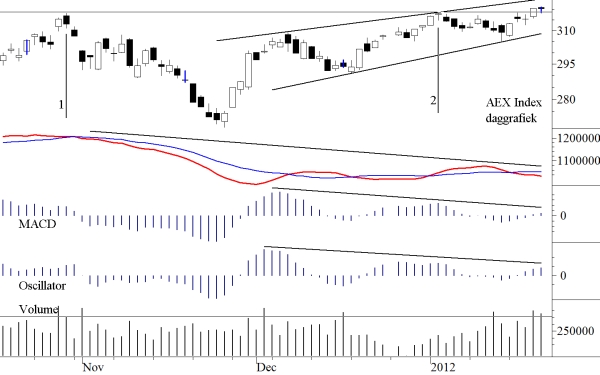 In de weekgrafiek was vorige week te zien dat de AEX zich in een stijgende driehoek bevond. Wij hebben daarbij aangetekend dat hij eerst nog een correctie moest ondergaan alvorens aan een uitbraak aan de bovenzijde gedacht kon worden (doel 280, waarvan wij zeiden dat hij daar niet zou komen). Na de uitbraak afgelopen week aan de bovenzijde van de driehoek tekenen wij hierboven het korte termijn stijgingskanaaltje dat binnen de oplopende driehoek te onderscheiden was.
