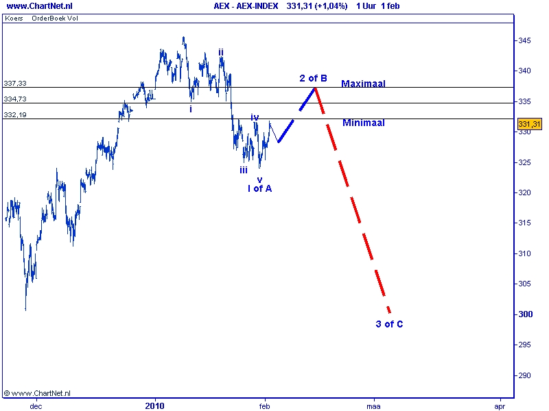 Zodra de eerste fase van daling compleet is, is een herstel over de daling te verwachten die meestal 50% tot ruim 61% van de daling goed maakt. Voor de AEX komen deze percentages overeen met de volgende punten een 50% herstel levert een stand op van 334,75 en een herstel van 61,8% zou de AEX naar een stand van 337,30 moeten voeren, ervan uitgaande dat de bodem is gezet op 323,95.