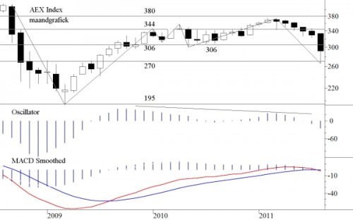 Er zijn zes zwarte candles gezet en met de zesde werd de vorige bodem op 306 doorschreden. De koersval werd tegengehouden door de steun op 270. Hiermede is een lagere bodem bereikt. Er is nog geen lagere top, maar of een long op de dagcharts een koersherstel kan geven tot boven 374 geloven natuurlijk alleen de naïevelingen onder ons, want daar is geen enkele reden voor te vinden. De Momentum Analyse divergeert nog steeds negatief en de MACD is door de nullijn gevallen. Amsterdam is een van de weinigen die in de maandgrafiek een lagere bodem toont en dat is misschien de enige positieve noot bij de lange termijn grafieken, want ook in de grote markten van deze wereld wordt op de lange termijn driftig negatief gedivergeerd.