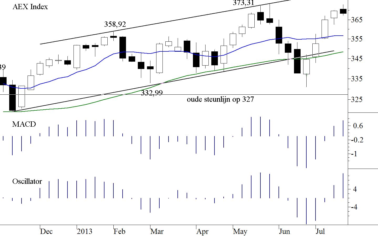 Na vier witte candles verscheen er dus een kleine zwarte. Het ziet er niet naar uit dat dit een negatief candle patroon gaat opleveren. Maar de eerdere top op 373,31 werd met 373,13 net niet gebroken. Dit moet wel gebeuren, want een tweede zwarte candle bevestigt een lagere top. En gezien het feit dat de laatste bodem lager lag dan zijn voorganger betekent dit dat de week in een baisse is gekomen. Het spant dus. In de indicatoren vindt men echter (nog) geen aanwijzingen, dat de markt in problemen aan het komen is. En dat betekent eigenlijk dat de AEX Index in de komende week (misschien weken als er nog langer geaarzeld wordt) de top gaat breken. Daarmede zouden de kansen aanzienlijk verbeteren. Toch gaan wij er vanuit dat een correctie in aantocht is. Men vindt deze ook aangekondigd in het gedrag van het Volume. De omzetten blijven sinds de bodem van juni 2012 achter bij de stijgende koerslijn. Zoiets kan lang duren maar het vertaalt zich altijd in een flinke en/of langdurige daling van de markt (volgende week zullen wij hier iets ruimer aandacht aan gaan besteden in onze Technische Belegger). Een nieuwe top lijkt mogelijk, omdat deze in Amerika reeds werd gezet. Het probleem is Duitsland want daar is de markt wat achtergebleven, maar gelukkig is daar geen sprake van een lagere bodem. Al met al zijn wij dus nog niet pessimistisch maar een duidelijke correctie zit wel degelijk in de pan en dan moet u denken aan september of oktober waarin het onvermijdelijke toch gaat gebeuren. Alle timeframes die wij gebruiken voor deze blog zijn op dit moment positief, maar als de markt op kortere termijn gaat draaien raken ze allemaal in een patroon van negatieve divergentie, hetgeen opnieuw een waarschuwing is voor een dalende beurs op iets langere termijn.
