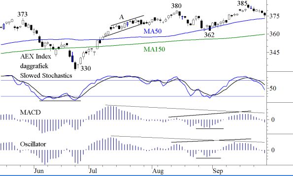 De markt is verdeeld, maar in het algemeen negatief. De reactie is niet uitgewerkt en zonder nieuwe goede berichten zal het nog even duren voordat men kan denken aan een herstel. Het Syrië-probleem staat voorlopig niet meer op de agenda. Iran zou de inspiratie kunnen zijn voor nieuwe goede berichten. De tapering blijft een zwaard van Damocles. Of het herstel van de wereldeconomie van grote invloed zal zijn is een vraagteken. En tot slot zijn er dan nog de interne begrotingsperikelen in de USA, waar nog geen pijl op te trekken valt. De Technische Analyse wacht op koopsignalen. Wij hebben er geen enkele gevonden. De korte termijn ziet er niet volledig negatief uit. Alles is dalende maar er wordt niet negatief gedivergeerd. De midden en lange termijn zijn negatiever dan de korte termijn, maar ook duidelijk verdeeld. Europa (inclusief Nederland) doet het nog steeds beter dan de Verenigde Staten. Wij laten hieronder de daggrafiek van de AEX Index zien.