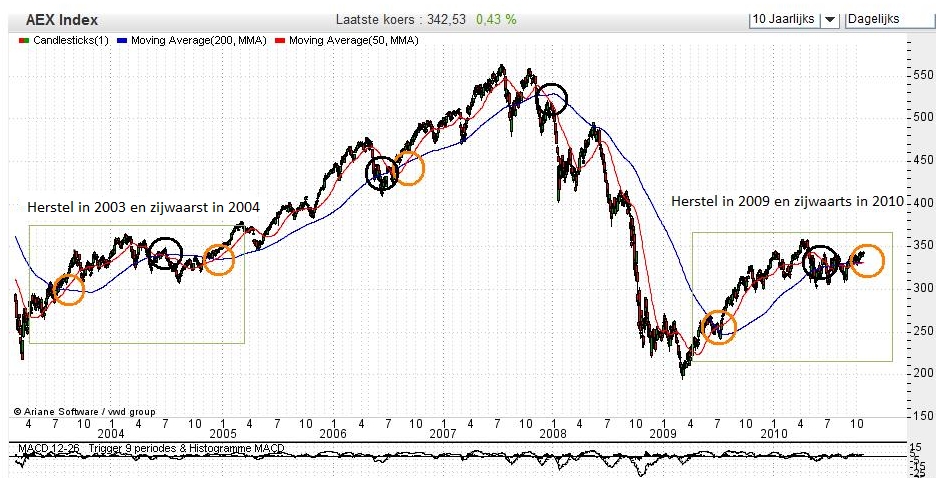 Als we kijken naar de afgelopen jaren dan doet zich nu precies het zelfde voor. Ook nu zien we na een harde stijging in 2009 een zijwaartse beweging waarbij snel na een “Black Cross” een Golden Cross wordt gevormd.