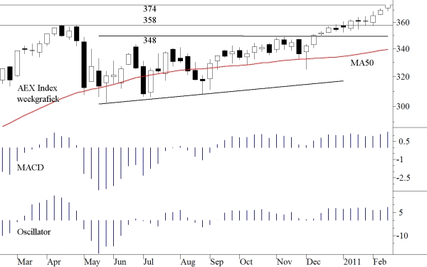Stand van de AEX Index op het moment van schrijven (20 februari 2011) 374,19.