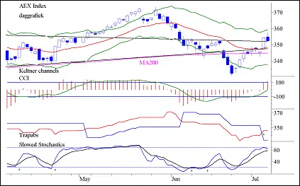 Eerder hebben wij u gewezen op de drie korte termijn koopsignalen die ontstonden. Het eerste zal slechts sporadisch gevolgd zijn. Alhoewel het een valide signaal was, dan ware het toch zekerder geweest als de kruising van de beide Stochastics boven de onderste horizontale lijn had gelegen. Daar komt bij dat een eerste signaal vaak gevolgd wordt door een tweede signaal vanuit een lagere bodem. Zo ook in dit geval. Maar er was dit keer een (niet vaak voorkomend) derde signaal nodig om de markt inderdaad in een korte termijn stijgende trend te brengen. De ervaren belegger zou telkens waneer zich een nieuw signaal voordeed, hebben bijgekocht wetende dat de draai op komst was.