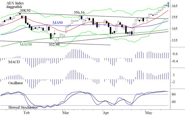 In de grafiek zijn duidelijke steunniveaus herkenbaar. In eerste instantie is er het gebied van 358 tot 356, op welke hoogte enige voorgaande toppen steun zullen geven. Daarbinnen ligt ook de Average True Range (de donkerblauwe lijn uit de Keltnerchannel). Een volgende steun ligt rond 362, de onderzijde van de Keltnerchannel en daarna volgt het MA50 rond 352. Tot slot volgt er nog het 150 MA op 344. In eerste instantie gingen wij ervan uit dat de afstand tot de top op 374 in twee opwaartse bewegingen zou worden afgelegd. De grote liquiditeit, die in de markten gepompt werd en wordt is de onbetwiste oorzaak van de voortdurende hausse. Deze liquiditeitovervloed is er nog steeds. Men mag daarom niet verwachten dat de reactie diep zal reiken. De reactie zal echter ongetwijfeld komen, maar wij houden het erop dat MA50 niet genomen zal worden. Er is in de onderstroom ook geen enkele aanwijzing te vinden dat er met een grotere daling rekening moet worden gehouden. De komende week staat in de statistieken als een zeer positieve week bekend. Het overbekende mei-effect (“Go away in May”) is inmiddels door de statistiek achterhaald. Het is de maand juni waarin normaliter de slappe periode zich inzet.Â