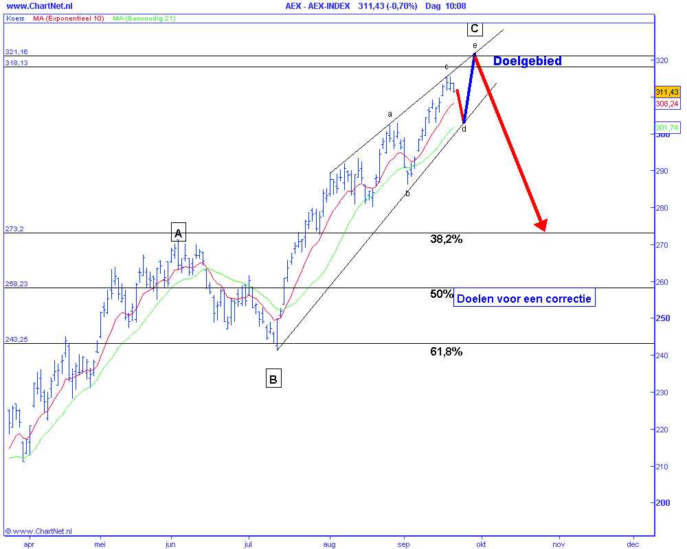 Op dit moment is er waarschijnlijk een kleine correctie in ontwikkeling tot 302-305. Een laatste stijging tot 316-322 zal in dat geval de opleving vanaf 241 af kunnen ronden.