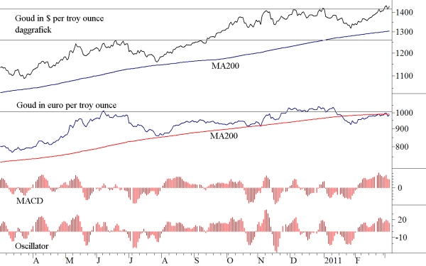 In deze verwarrende en onzekere tijd voor Noord Afrika en het Midden Oosten kan er natuurlijk geen verstandig woord gezegd worden over de ontwikkeling van de prijs van een vat Brentolie. De markt verkeert in onzekerheid en betaalt wat men vraagt. Bij het aanschouwen van het technische beeld kunnen wij u maar één gezegde voorhouden: “Wat hoog stijgt kan diep vallen”. Wij blijven hierop hopen in de wetenschap dat de stijging van dit moment geen realiteit weerspiegelt.