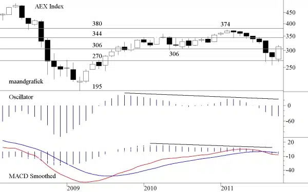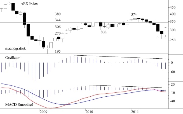 Alle (korte termijn) technische systemen, die voor ons de koopsignalen moeten generen, waarschuwden ons allemaal, zonder uitzondering, in de afgelopen dagen dat de markt rijp is om in te stappen. In totaal kan men van een positief beeld spreken maar er zijn nog een aantal waarschuwingen die tot voorzichtigheid manen. Wij noemen de omzet, die nog steeds achterblijft, ook al was deze afgelopen donderdag, bij de vorming van de Gap, duidelijk hoger. Ook de AD-lijn blijft negatief divergeren en de Summation index, althans in de configuratie zoals wij die gebruiken is nog dalend. En de maandgrafiek van de AEX, die ons zo dwars zat is nog niet positief maar hij is wel aan het draaien. Wij laten hem hieronder zien.