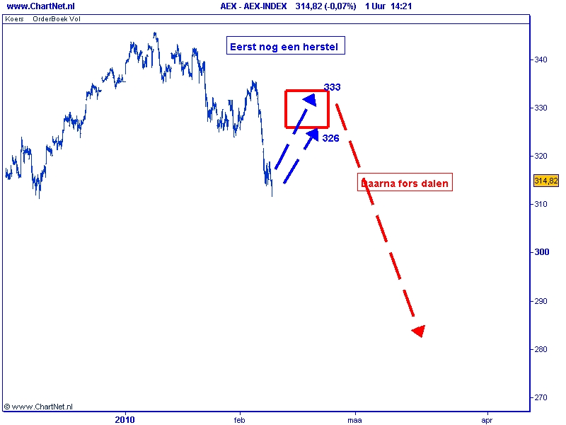 Is deze veronderstelling juist, dan is de komende dagen meer herstel te verwachten. Zodra de AEX weet te stijgen boven 320 houd ik rekening met een herstel tot globaal 325 tot 330.