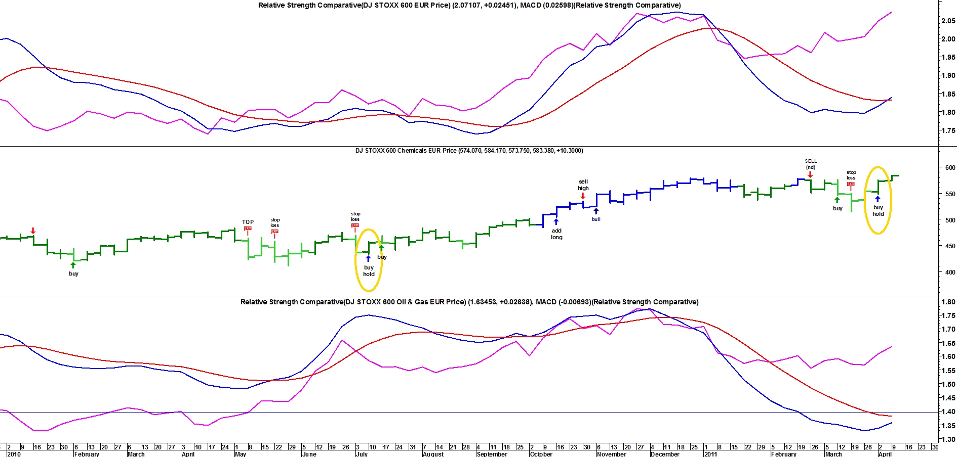 In de afgelopen week verzwakt de DJ Stoxx 600 Oil & Gas sector ten opzichte van de DJ Stoxx 600 Chemicals index ondanks de stijgende olieprijs. Omdat in de prijsstijging van olie een overdrijving wordt gemeten, wordt besloten om de DJ Stoxx Oil & Gas 600 sector te verwijderen ten gunste van de DJ Stoxx 600 Chemicals sector.