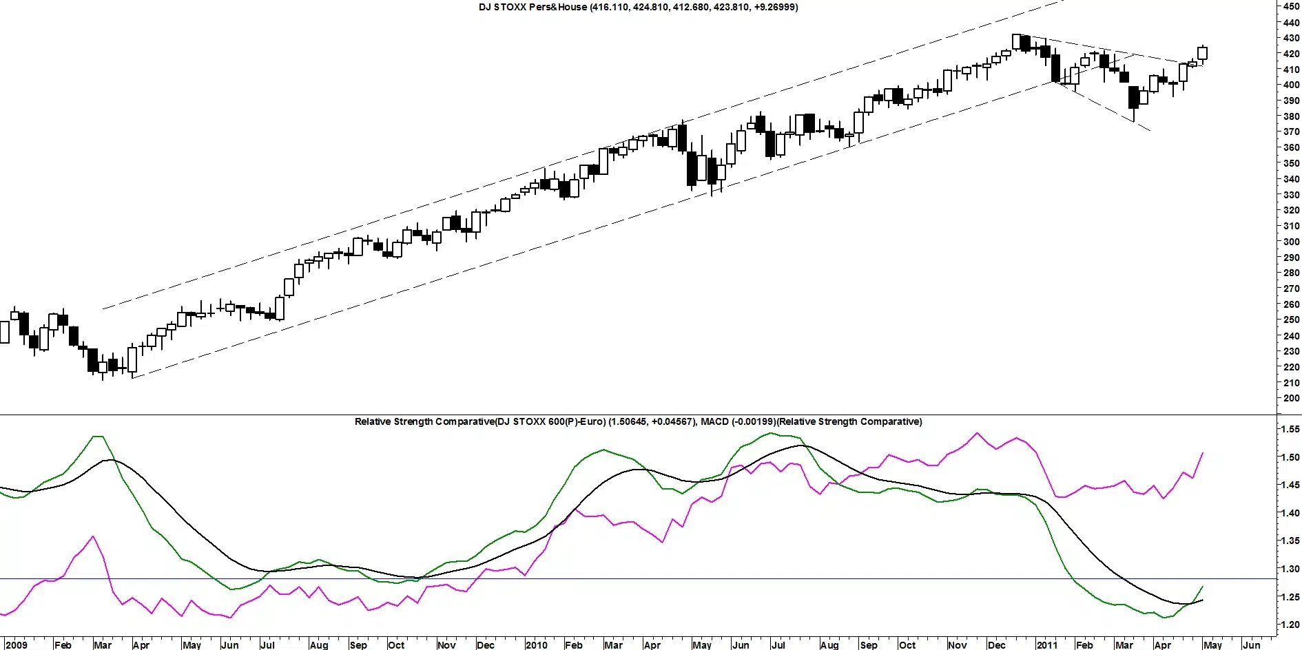 Voor de komende weken wordt een outperformance voorzien in de DJ Stoxx 600 Personal Care & Household sector. De sector is conform het technische analyse handboek uit een dalende ‘broadening wedge’ gebroken en de MACD van de relatieve sterkte lijn is weer opwaarts gekruld.