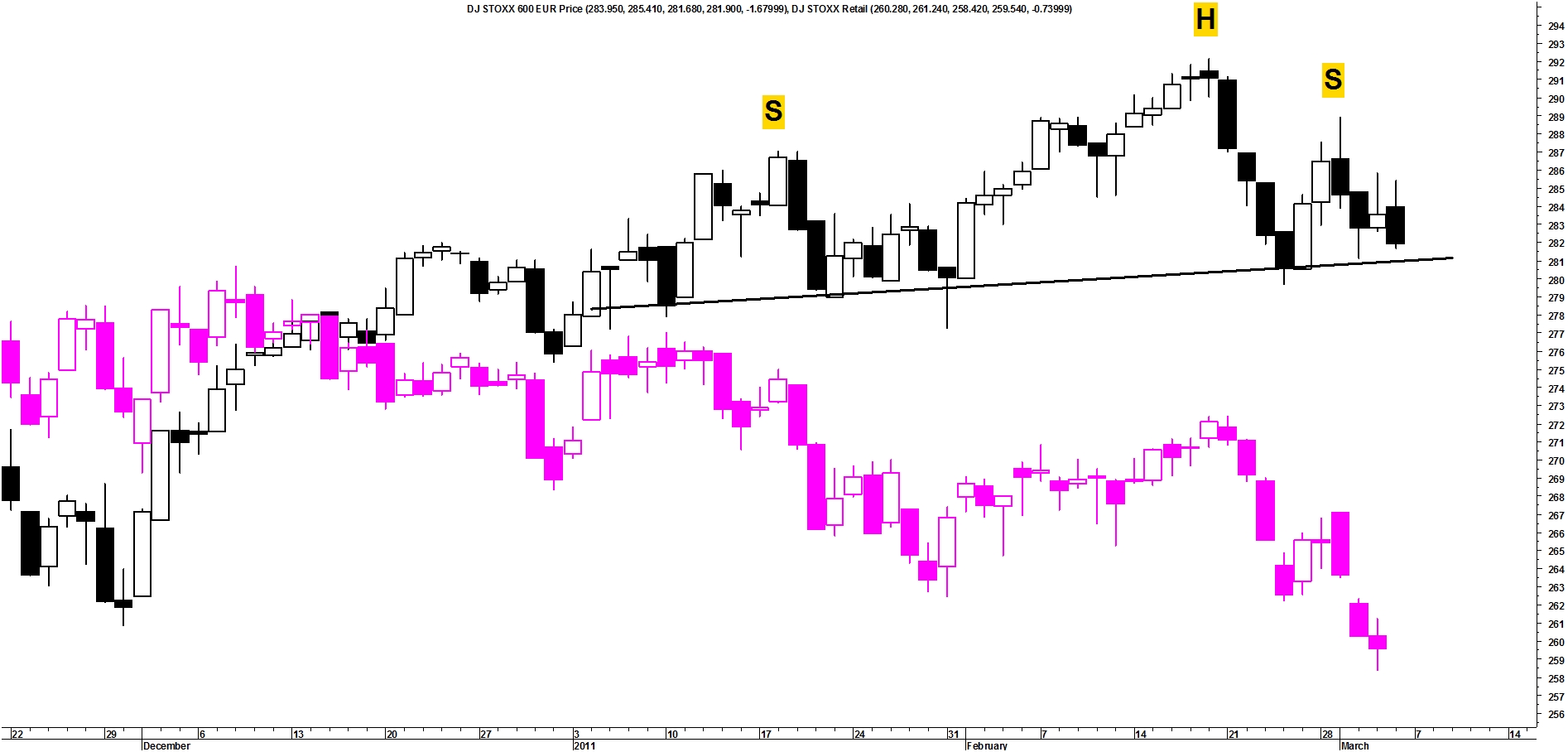 De LOEF TIP van deze week is om aandacht te schenken aan het (H)oofd(S)chouderpatroon in de Europese DJ Stoxx 600 index dit jaar. Dit wijst op topvorming. Mocht de aandelenmarkt inderdaad bezig zijn met een topvormingsproces dan lijkt de Europese retail sector kandidaat voor een periode van underperformance.