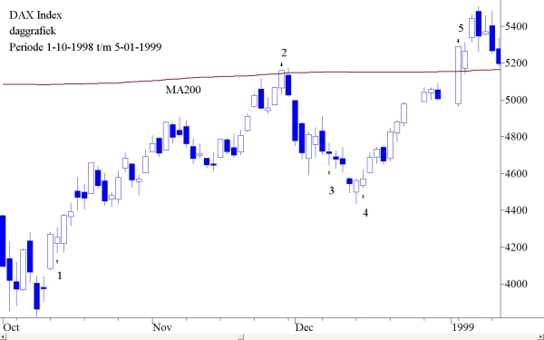 De moeilijkheid van een Stoploss is dat men verliezen neemt die achteraf gezien niet nodig waren geweest. “Maar hoe kan men dat weten?” Wij laten u hieronder nog een andere stukje uit de grafiek van de DAX zien. Dit begint op 1-10-1998 en eindigt op 5-01-1999.
