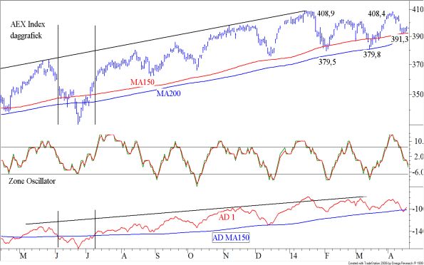 Dit brengt ons op de grafiek onderaan in de figuur. Het is een AD-studie, die ook wel de Low Frequency Trading Index genoemd wordt. Doorkruising door de AD-lijn van het MA150 betekent dat men de markt moet verlaten. Kijk bij wijze van voorbeeld naar de periode mei-augustus van het vorige jaar. Toen brak de koers door zijn MA150 en zijn MA200. De AD-lijn brak door zijn MA150 en hij bleef daar onder liggen totdat de markt zich herstelde. De AD-lijn heeft de neiging om te fluctueren rondom zijn MA150 voordat hij inderdaad naar beneden uitbreekt. Deze fluctuatie heeft zich nu ingezet. Wij zien dit als de eerste bevestiging, dat wij aan de vooravond staan van een correctieve beweging, die de koersen op een duidelijk lager niveau zal brengen. Een koers van de AEX Index beneden zijn MA150 (op dit moment 386) zet de boel op scherp.