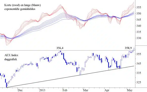 Tijdens een rally komt er steeds een moment dat de koers teveel van zijn lange termijn gemiddeldes afwijkt. Een terugkeer naar deze gemiddeldes is onvermijdelijk. Men noemt deze terugkeer “mean reversion”. Als men naar de waaier van gemiddeldes kijkt, waarbij de rode lijnen de korte en de blauwe lijnen de langere gemiddeldes zijn, dan ziet men dat de afwijking tussen de korte en de langere op dit moment zeer groot is. De koers is te hard gestegen en een reactie zal logischerwijs volgen. Deze reactie kan de komende dagen al starten. Hiervoor zijn aanwijzingen te vinden. De laatste dagcandles zijn mogelijke omkeercandles. De S&P500 zette afgelopen vrijdag een Hanging Man neer en de DAX eindigde met een Doji, die gemakkelijk uit kan groeien tot een Doji Star. De Momentum Analyses zijn in alle markten gaan dalen. Er is overigens basaal niets mis met de ontwikkeling van de AEX Index. Alle timeframes voor alle grote indexen zien er positief uit. Voor de AEX Index verwachten wij dat de steun op 356 het niet zal houden, maar de vorige bodem op 342 zal niet worden doorschreden. Daarmede zal de aan de gang zijnde hausse niet worden doorbroken, maar zoals reeds eerder gezegd zijn de perspectieven voor een daarna volgende periode minder goed. De onderstroom van de markt is niet helemaal in orde en daar mag men met de vakanties in aantocht geen snel herstel in verwachten. Opvallend is het dat deze onderstroom in Amerika zich aan het verbeteren is. Niettegenstaande dit gegeven zien wij op dit moment, na een hernieuwde poging de weerstand op 374 te breken een grotere correctie opdoemen, die ons tot ver in de zomer zal brengen.