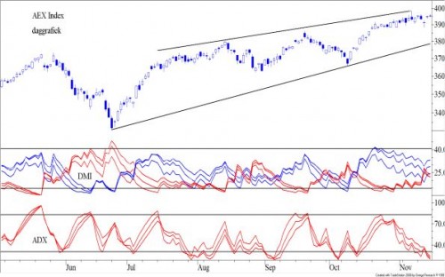 Bovenaan in de figuur ziet u de dagkoersen van de AEX Index. Daar is niets op aan te merken. De markt is à la hausse. Half oktober heeft zich een reactie ingezet, die zich ontpopte als een consolidatiefase, vergelijkbaar met de reactie in juli van dit jaar. Onmiddellijk daaronder ziet u een samenstel van blauwe en rode lijnen. De blauwe zijn de DM-plus (met verschillende parameters) en de rode zijn de DM-min (ook met verschillende parameters). Toppen in het koersniveau gaan gepaard aan toppen in de blauwe lijnen. Bodems in het koersniveau gaan gepaard aan toppen in de rode lijnen. Daaronder ziet u de ADX met verschillende parameters. Toppen in de ADX vallen samen met toppen in de koersen en bodems met bodems in de koersen. Signalen van de DM-lijnen moeten bevestigd worden door signalen van de ADX grafiek. Signalen worden sterker als de toppen (bodems) in de DM’s vallen buiten de horizontale lijnen van 50 en 10. De signalen van de ADX zijn sterker als ze vallen buiten de lijnen 70 en 28. Daarnaast worden signalen sterker als de lijnen, die het signaal geven, dichter bij elkaar liggen. Kruisingen van een enkelvoudige DM-plus lijn met een DM-min lijn (met gelijke parameters) worden door korte termijn investeerders vaak gezien als korte termijn koop- en verkoopsignalen. Daar gaat het hier niet om.