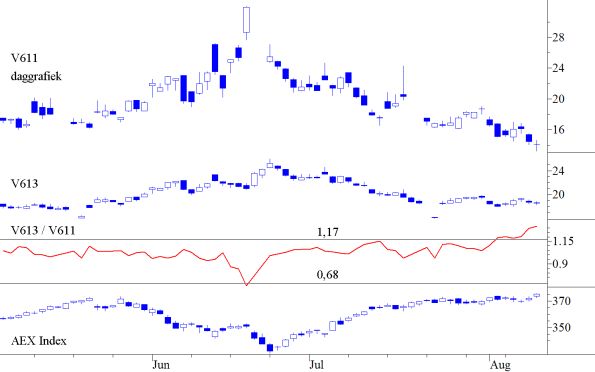 Het kan verkeren. De AEX Index bleek afgelopen week een van de sterkste markten te zijn. Er werd een nieuwe top gezet en dat geschiedde niet in Amerika noch bijvoorbeeld in Duitsland. Frankrijk voegde zich bij de euforie in Amsterdam. Amerika loopt voorop met de dalingen. Hier zijn niet alleen de daggrafieken maar ook de weekgrafieken negatief, hetgeen nog niet het geval is in Europa. Maar wij schreven vorige week in de Technische Belegger, dat er een reactie in de maak is, welke heel gemakkelijk kan ontaarden in een grotere correctie, de tweede poot omlaag waar wij al eerder over hebben geschreven. En de reactie, die in Amerika reeds is toegeslagen, staat ook in Europa op stapel. Want de Europese markten lopen op hun laatste benen. Wij laten u hieronder een grafiek zien van de Spread tussen de V611 en V613.