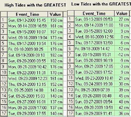Springtij doet zich voor wanneer de zon en de maan ten opzichte van de aarde op ƩƩn lijn staan en elkaar qua aantrekkingskracht versterken. Doodtij en dus lage waterstanden doen zich voor wanneer de zon en de maan elkaar tegenwerken en de zwaartekracht minimaal is. De waterstanden blijken in de praktijk uitstekende indicatoren voor toppen en bodems in de markt. Zo voorspelden de low tides with the greatest value de top van 11 september jl. op de dag nauwkeurig. In sommige gevallen voorspellen de tides de top en bodem zelfs op dagbasis perfect. Zie hier bijvoorbeeld de waterstanden van Amsterdam van maandag 14 september. De hoogste waterstand werd voorspeld om 10.50 uur, hetgeen tevens, zie de AEX-grafiek, de bodem van de dag liet zien. De low tide van maandag lag om 17.12 uur en daar troffen we ook de top van de dag aan.